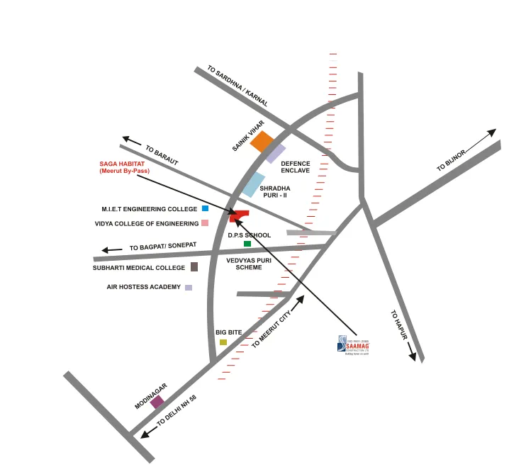 Thanks to its excellent location on NH-58 (Delhi-Dehradun Highway), Saga Habitat is highly accessible from major cities and other prominent destinations. It is located right across from MIET College, which ensures that this project will be easily accessible and well-linked to central Meerut and other nearby urban hubs. The residents will also enjoy the benefit of being in close proximity to renowned institutions such as GD Goenka School and healthcare facilities like Subharti Medical College.